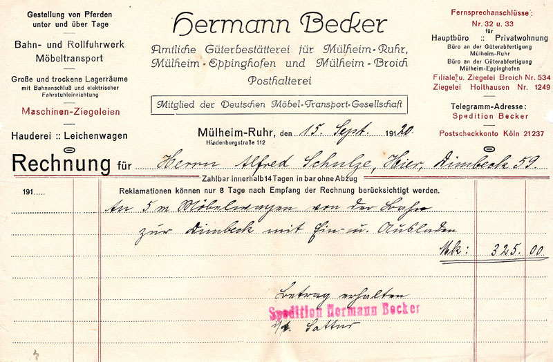 Zu diesen beiden Geschäftszweigen kam der Transport von Gütern in eigenen Fuhrwerken landauf, landab, und nachdem die Eisenbahn sich durchgesetzt hatte, die Beförderung von und zur Bahn. All diese Betriebsamkeit erforderte oftmals den Bestand an einigen hundert Pferden. Noch bis zum Ausgang des vorigen Jahrhunderts erfolgte die Gestellung von Postpferden durch die Firma, z. T. sogar noch bis zum Jahre 1923, in welchem die Paketwagen durch posteigene Autos abgelöst wurden. Lange Jahrzehnte hat Hermann Becker die Anpassung an die sich ständig ändernde Geschäftslage vorgenommen und sich am Aufstieg seiner Firma freuen können. 1907 löste ihn sein Sohn Paul in der Geschäftsführung ab. Unter ihm entwickelte sich die Firma entsprechend der wieder struktuell veränderten Wirtschaftslage Mülheims zu einem Grossunternehmen, das von Mülheim aus Verbindungen in viele Länder unterhielt.